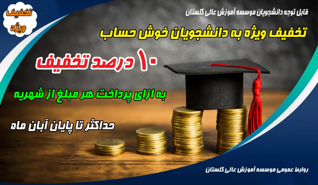 در صورت پرداخت هر مبلغ از شهریه، ۱۰ درصد تخفیف ویژه به دانشجویان خوش حساب (به ازای مبلغ پرداختی) تعلق خواهد گرفت. حداکثر تا پایان آبان ماه سال جاری فرصت دارید از این تخفیف ویژه استفاده نمائید. جهت کسب اطلاعات بیشتر به واحد امور مالی موسسه مراجعه و یا با شماره تماس ۴۳-۰۱۷۳۲۶۲۷۳۴۰ داخلی ۳۰۲ تماس حاصل نمائید.